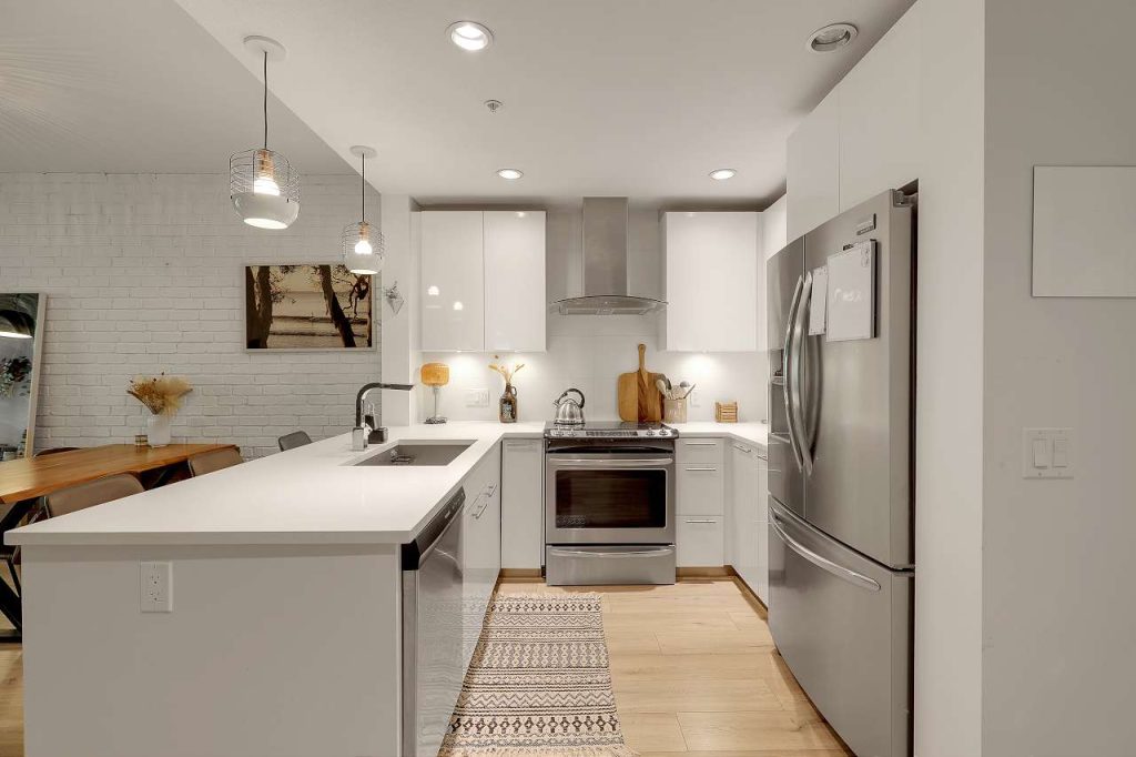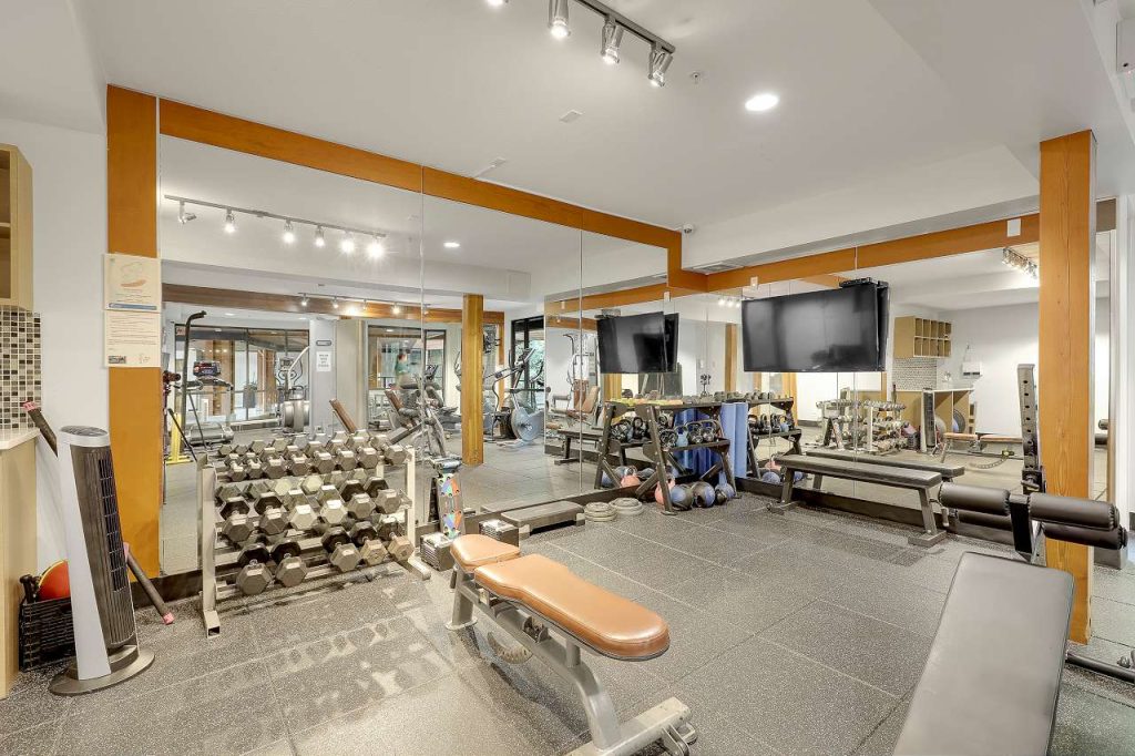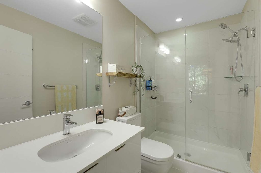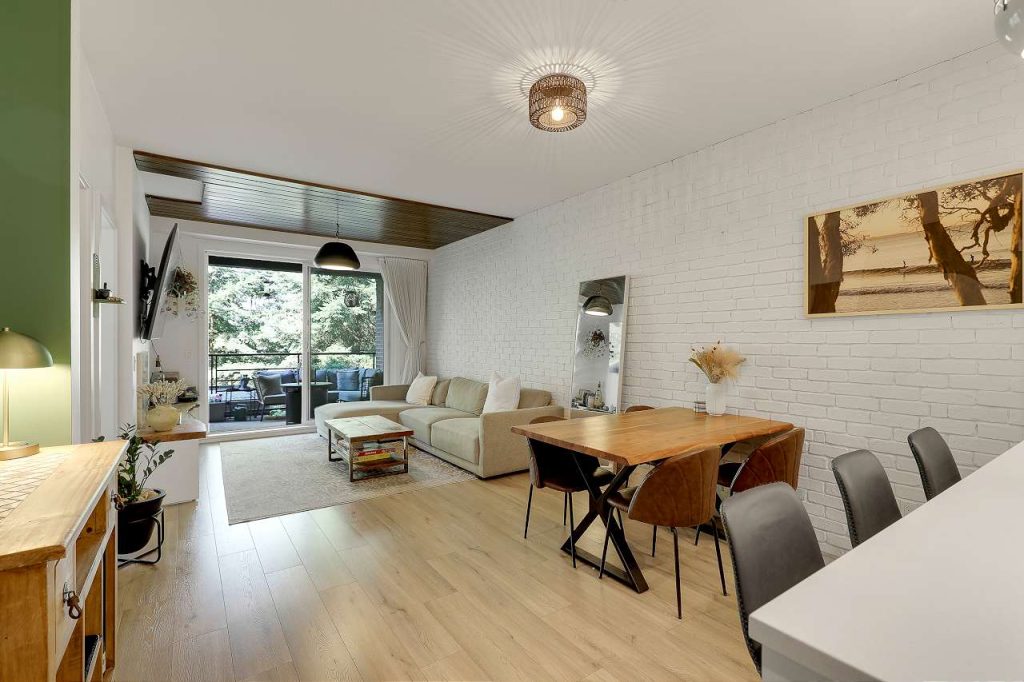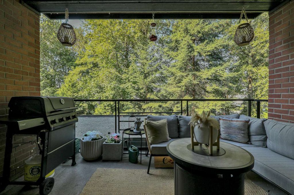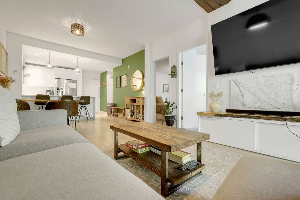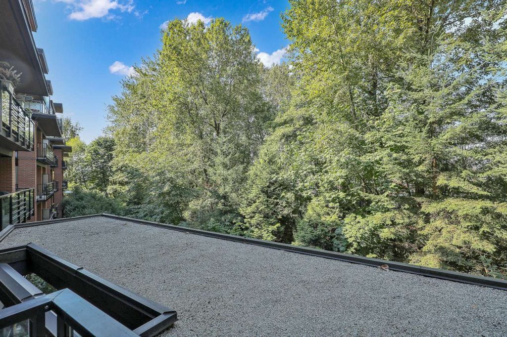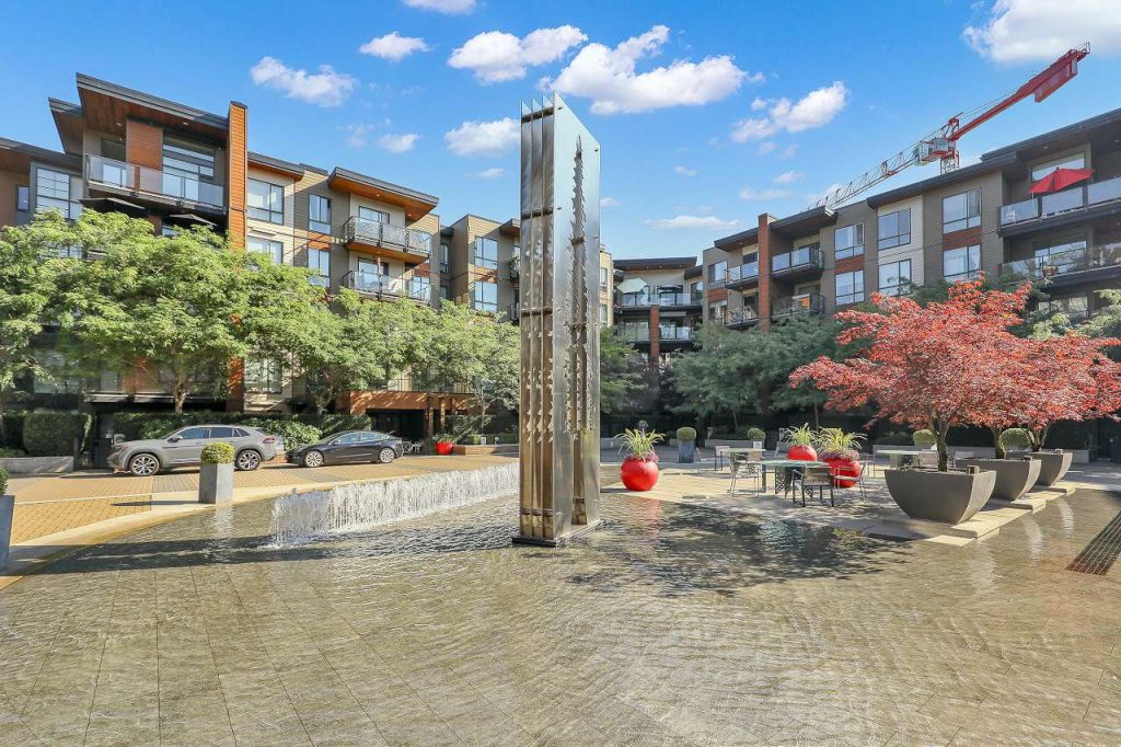 WestCoast modern & LEED certified "THE SHORE" by Adera. A remarkable and tranquil 2 bedroom / 2 bathroom home facing the Greenbelt and the Mosquito Creek, where you can enjoy morning walks or a jog on this scenic Trans Canada Trail. An open concept living space w/over-height ceilings offering an abundance of natural light, a spacious covered patio, large primary bedroom w/walk-in closet & an ensuite bathroom. Stunning designer details that include a white brick wall, wood ceiling slats, built ins & wide plank laminate flooring. An entertainer’s kitchen w/breakfast counter, S/S appliances & quartz counters. Steps to shops, trails and transit. Building amenities that incl a Gym, yoga studio, spin bikes, amenity room & playground. Parking & Storage incl.