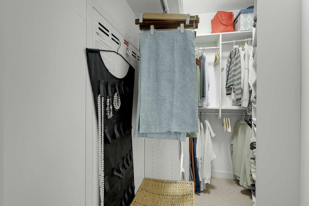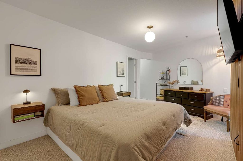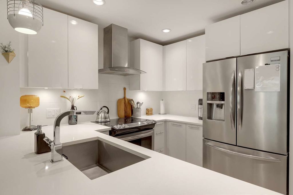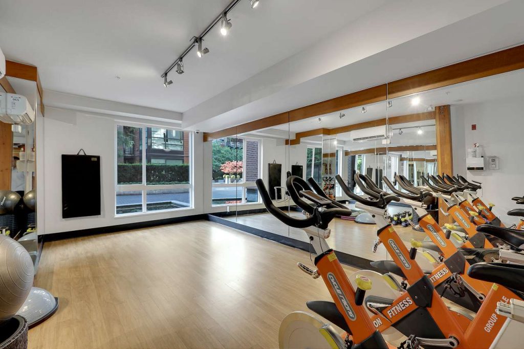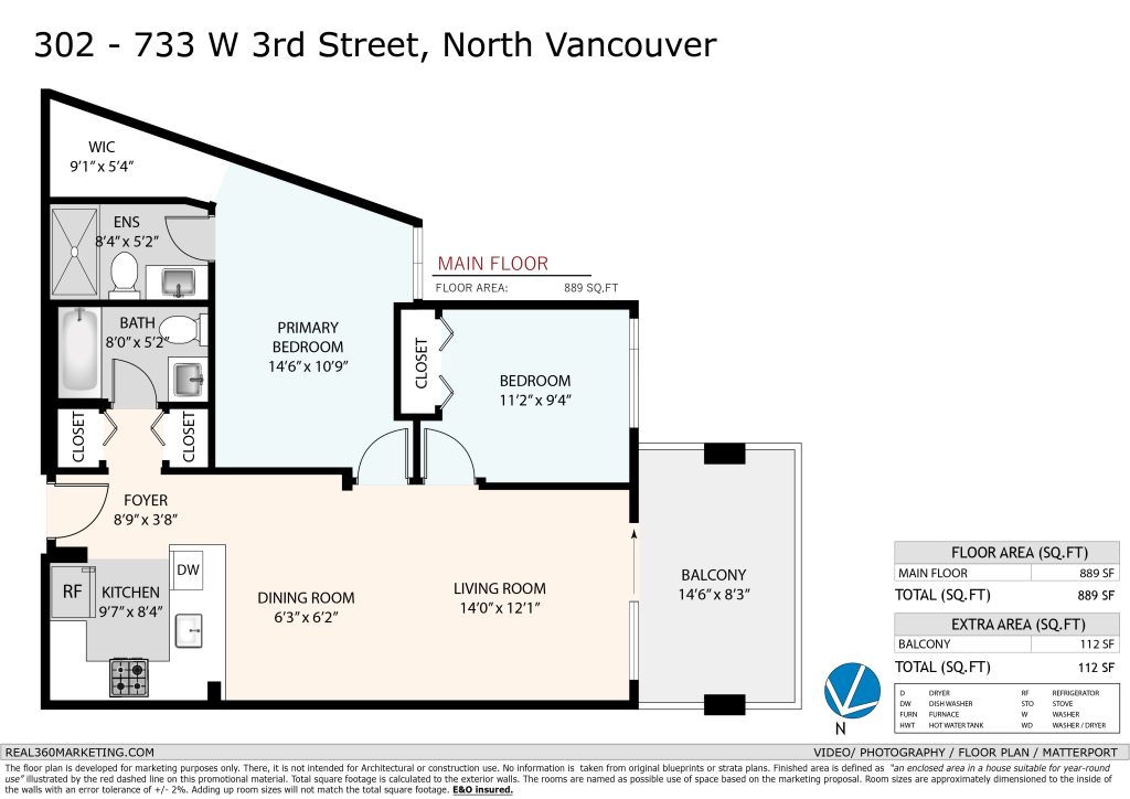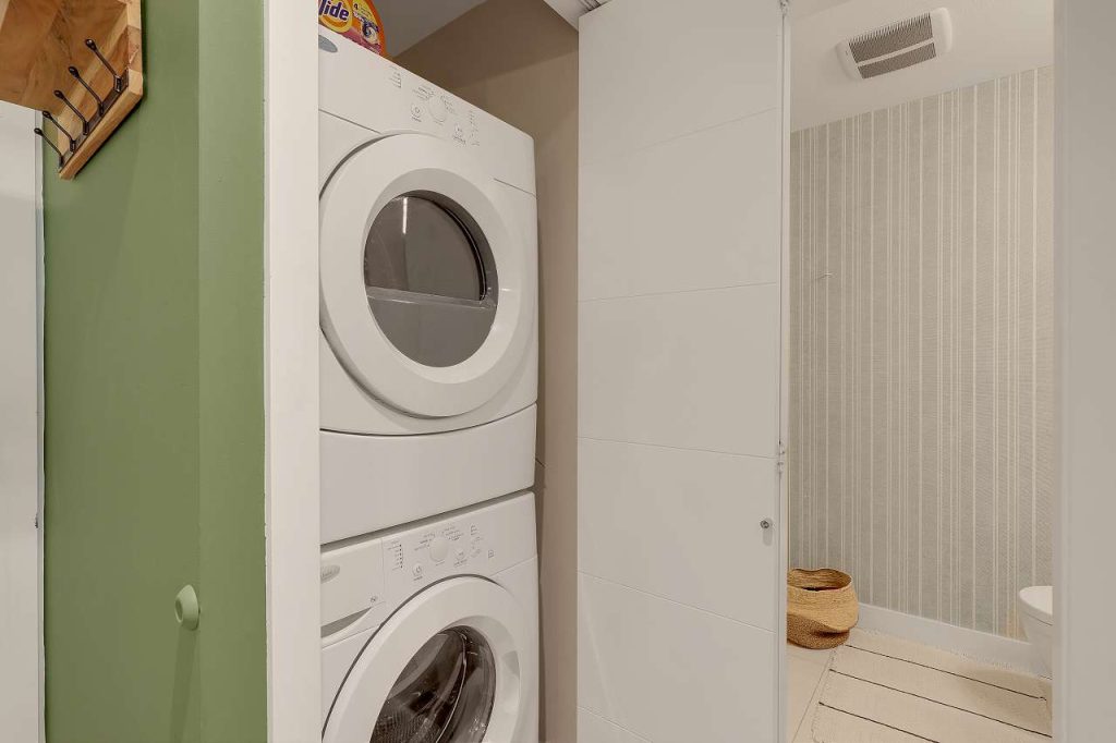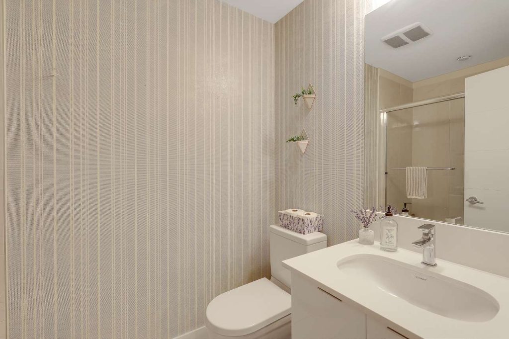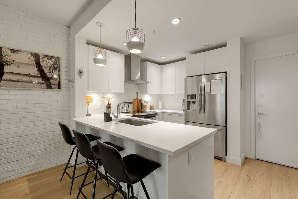 WestCoast modern & LEED certified "THE SHORE" by Adera. A remarkable and tranquil 2 bedroom / 2 bathroom home facing the Greenbelt and the Mosquito Creek, where you can enjoy morning walks or a jog on this scenic Trans Canada Trail. An open concept living space w/over-height ceilings offering an abundance of natural light, a spacious covered patio, large primary bedroom w/walk-in closet & an ensuite bathroom. Stunning designer details that include a white brick wall, wood ceiling slats, built ins & wide plank laminate flooring. An entertainer’s kitchen w/breakfast counter, S/S appliances & quartz counters. Steps to shops, trails and transit. Building amenities that incl a Gym, yoga studio, spin bikes, amenity room & playground. Parking & Storage incl.