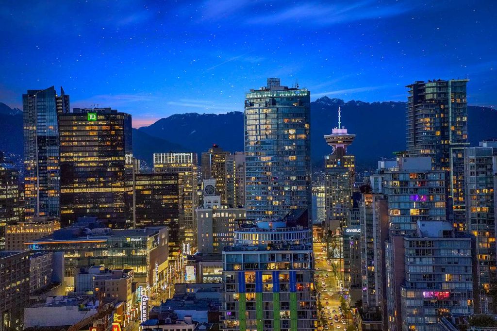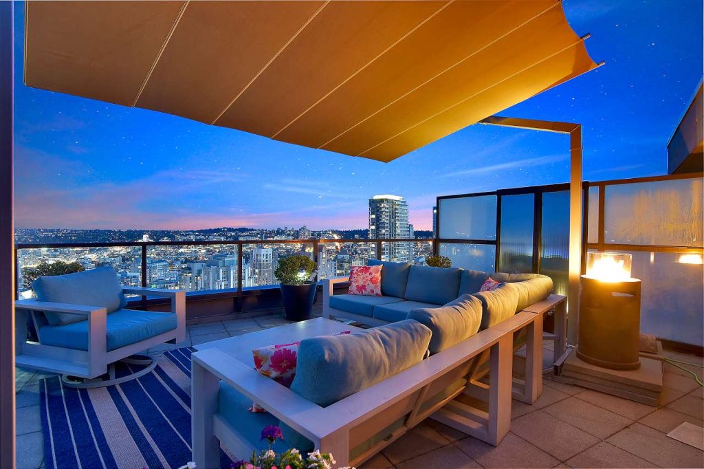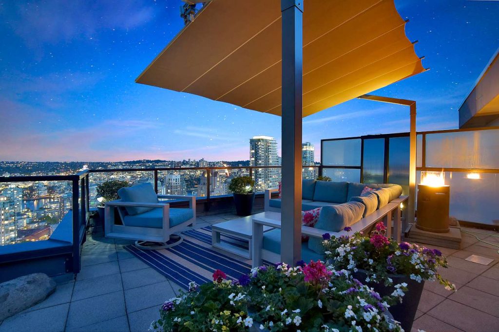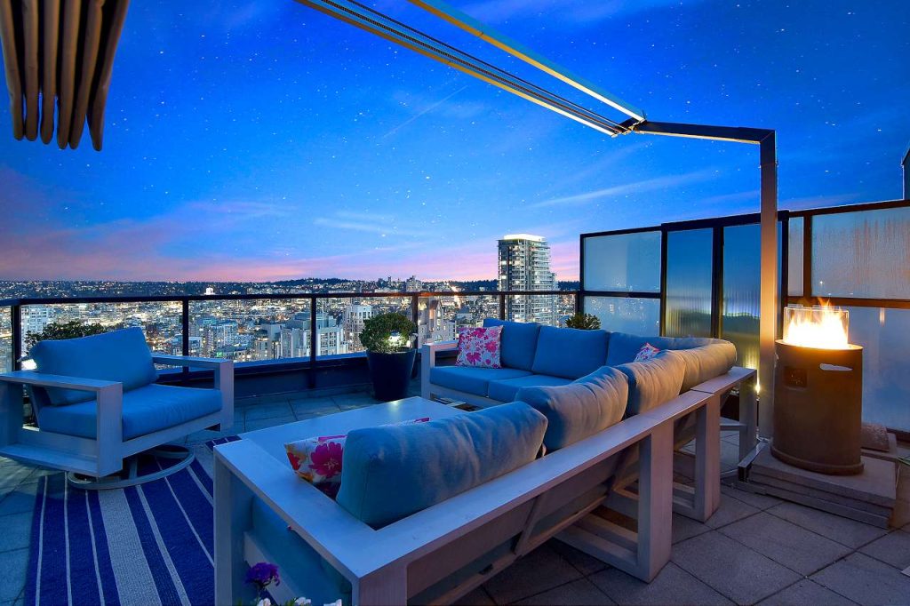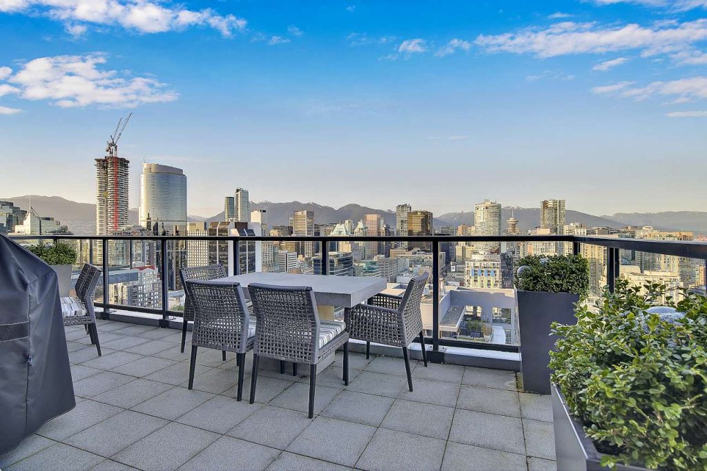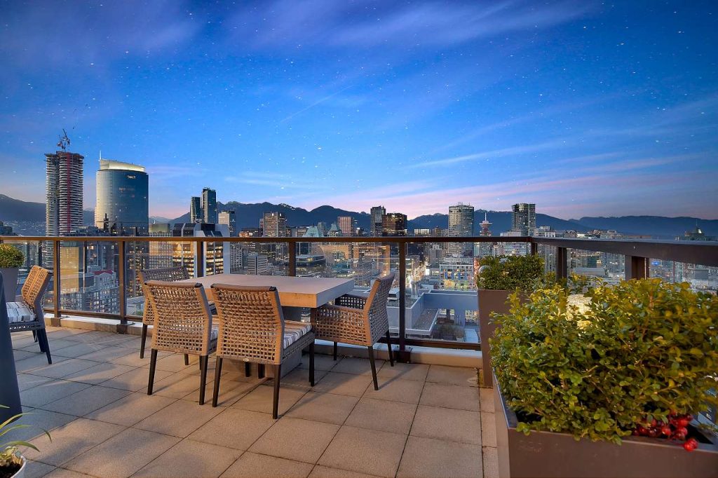 Elegant & Sophisticated Penthouse in the heart of Yaletown! Nearly 1900sf of indoor & outdoor living w/magnificent panoramic city, mountain & water views. Professionally designed w/over $250k spent on renos that incl a chef’s kitchen; Subzero, Miele, Bosch, high gloss cabinetry, ceasar stone waterfall island & backsplash, wide plank flooring, Air Conditioning, motorized blinds, Control 4 surround, European doors by Sapeli, smart lighting, built-ins, wine wall, list goes on. O/H ceilings w/floor-ceil windows, large Den w/a murphy bed/desk that is ideal for guests. Imagine entertaining or basking in the sun on your two large outdoor spaces, a terrace off the main level & a Rooftop patio. World class Amenities; Outdoor pool, Jacuzzi, Sauna, Gym, Guest suites, Concierge. Two Parking & Storage.