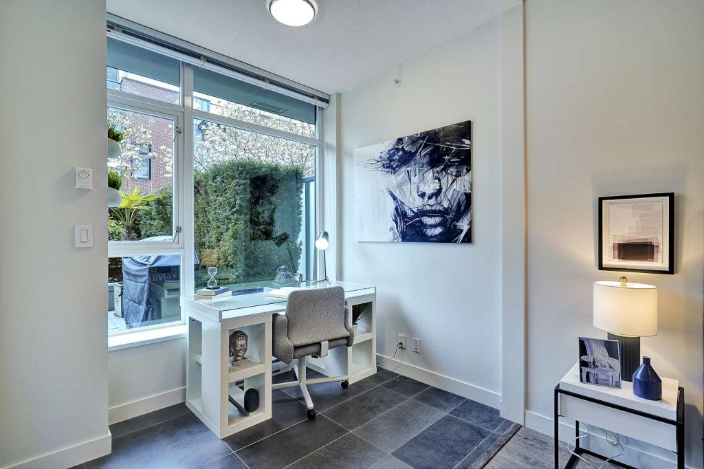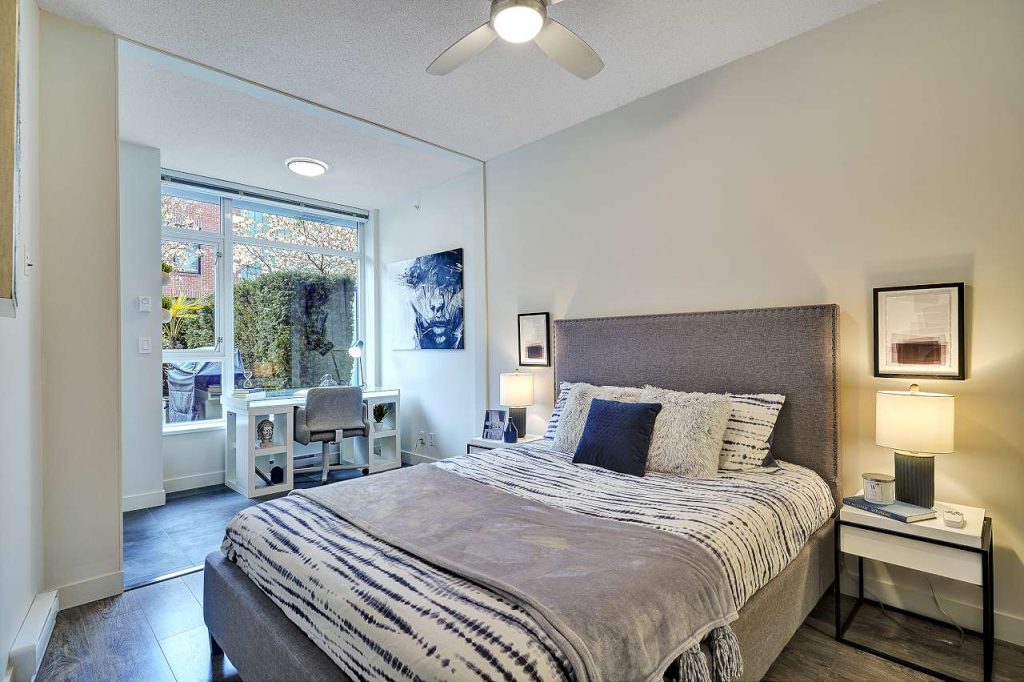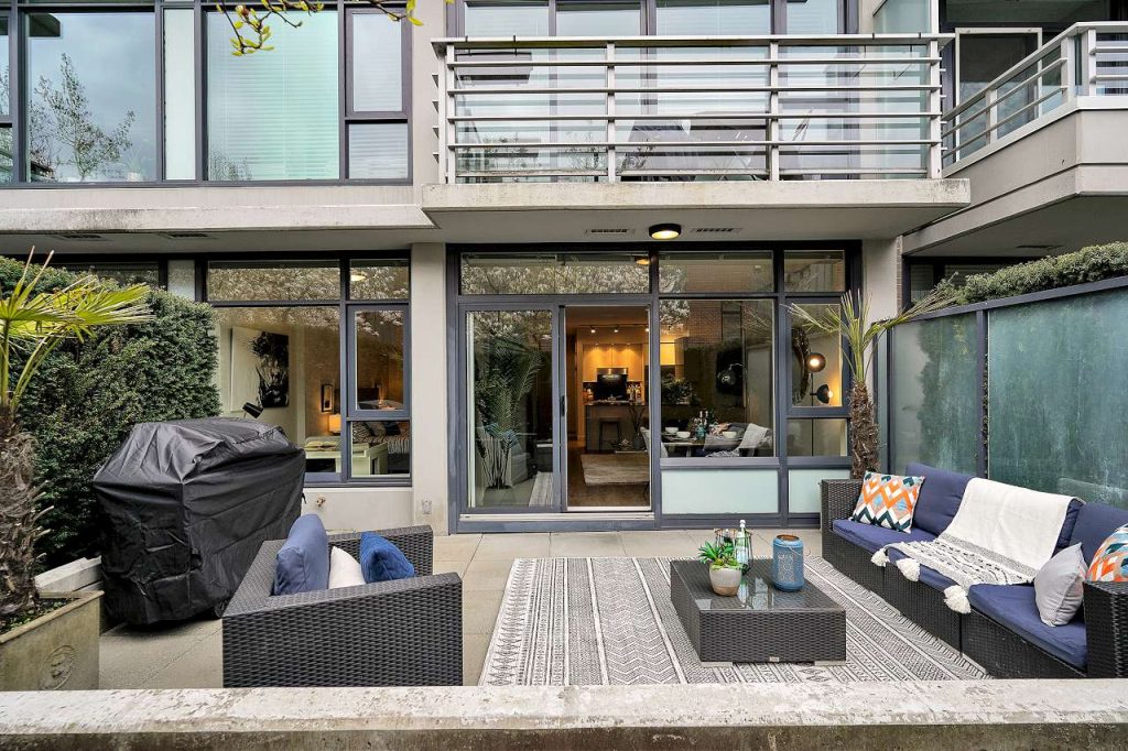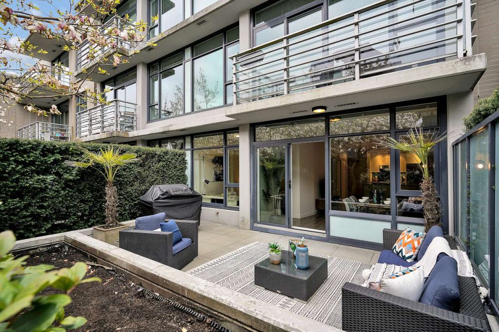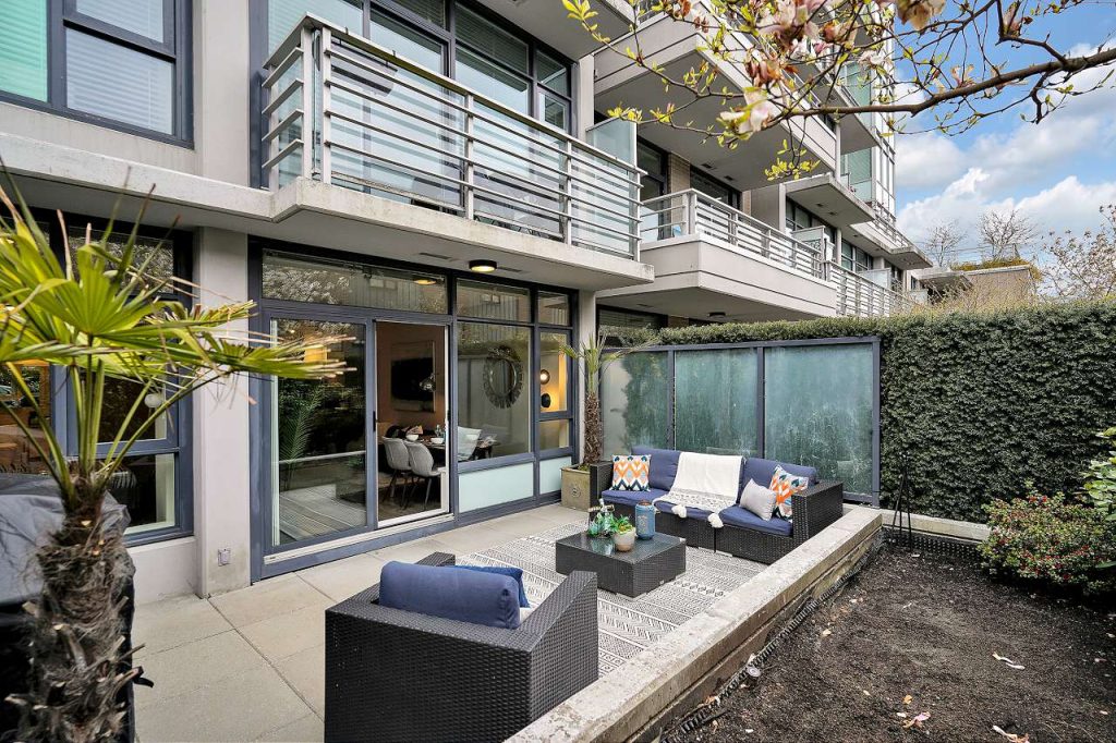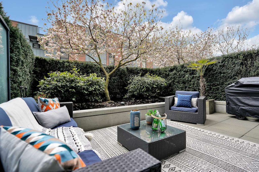 Summer Ready! Massive Sunny terrace patio Large One bedroom & DEN home in desirable Uptown. Upscale home that sits on the Quiet side of the building, private patio oasis surrounded by tall mature hedges that give extra privacy & your own cherry blossom Tree! Upgraded freshly painted home feat gourmet kitchen w/SS appls, stone waterfall counters, all rooms on a large scale that fit large furniture, functional open plan, bedroom w/walk thru closet, spa like ensuite, laminate flooring, built in closets, over height ceilings, floor to ceil windows w/ton of natural light. Fully equipped gym, spectacular rooftop & kids playground w/ 360 degree views. Convenient SoMa location in the heart of Mount Pleasant. Parking & Storage. Rentals & 2 dogs/cats okay.