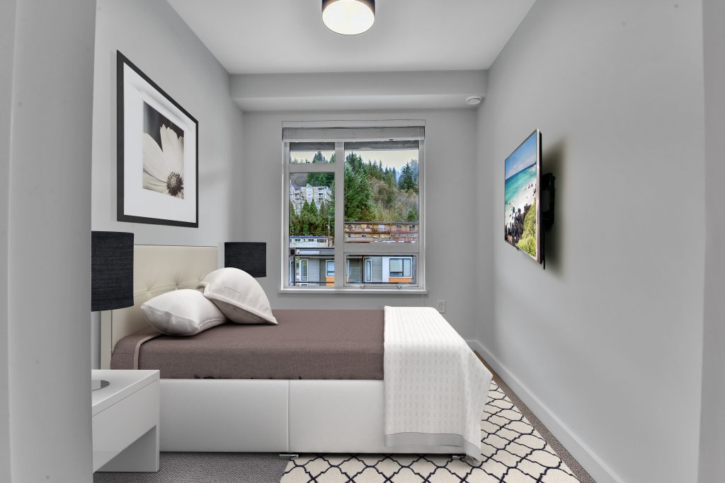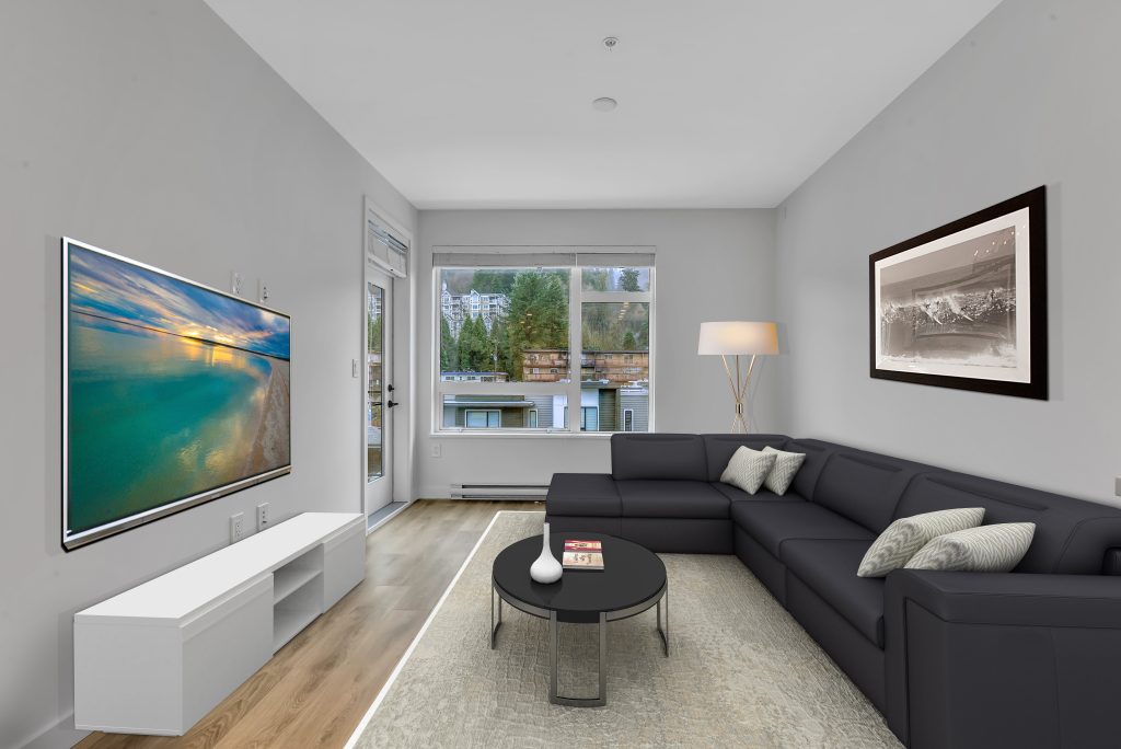 George by Marcon, upscale living in Port Moody! This bright, welcoming one bedroom and den home offers a most desirable, open floorplan. South facing, floor-to-ceiling windows with a large balcony to enjoy sunlight all day long. Open concept, overheight 9ft ceilings, gourmet kitchen, high-end appliances, gas cooktop, built-in microwave, quartz counters, laminate flooring, walk-in closet and insuite laundry. Impressive AMENITIES: car/pet wash station, bike/kayak/canoe rooms, workshop, playground, social room, courtyard. Steps to Skytrain, WestCoast express and Port Moody Hot Spots! 2-5-10 Warranty. Parking + Storage included.